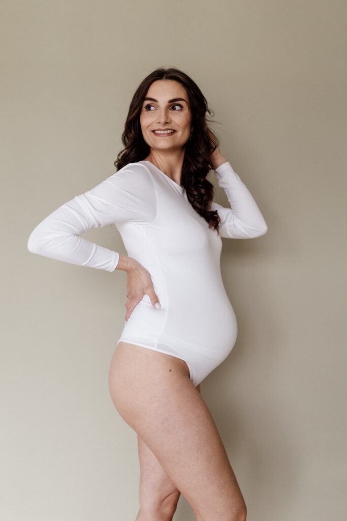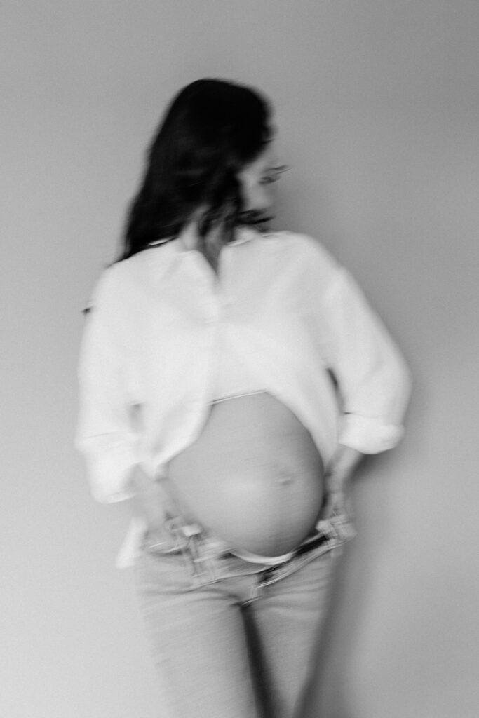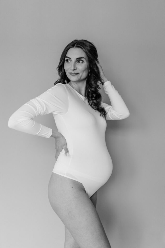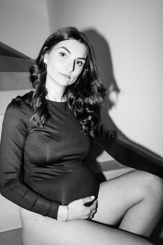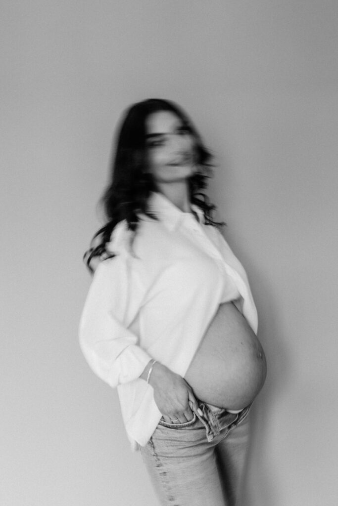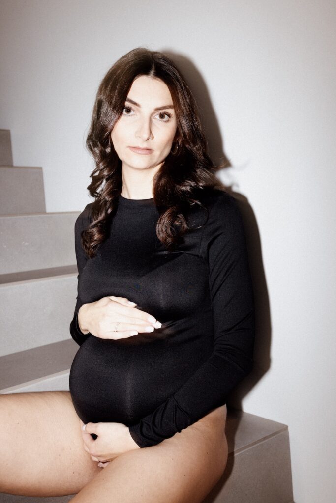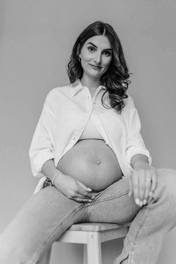Ich liebe diesen Babybauch-Look, weil er so wunderbar direkt ist. Der Frontalblitz verleiht den Bildern eine Dynamik, die sofort ins Auge springt. Kein sanftes Streicheln von Licht, sondern klare, harte Kontraste, die die Formen und Linien betonen – perfekt, um den Babybauch selbstbewusst in Szene zu setzen.